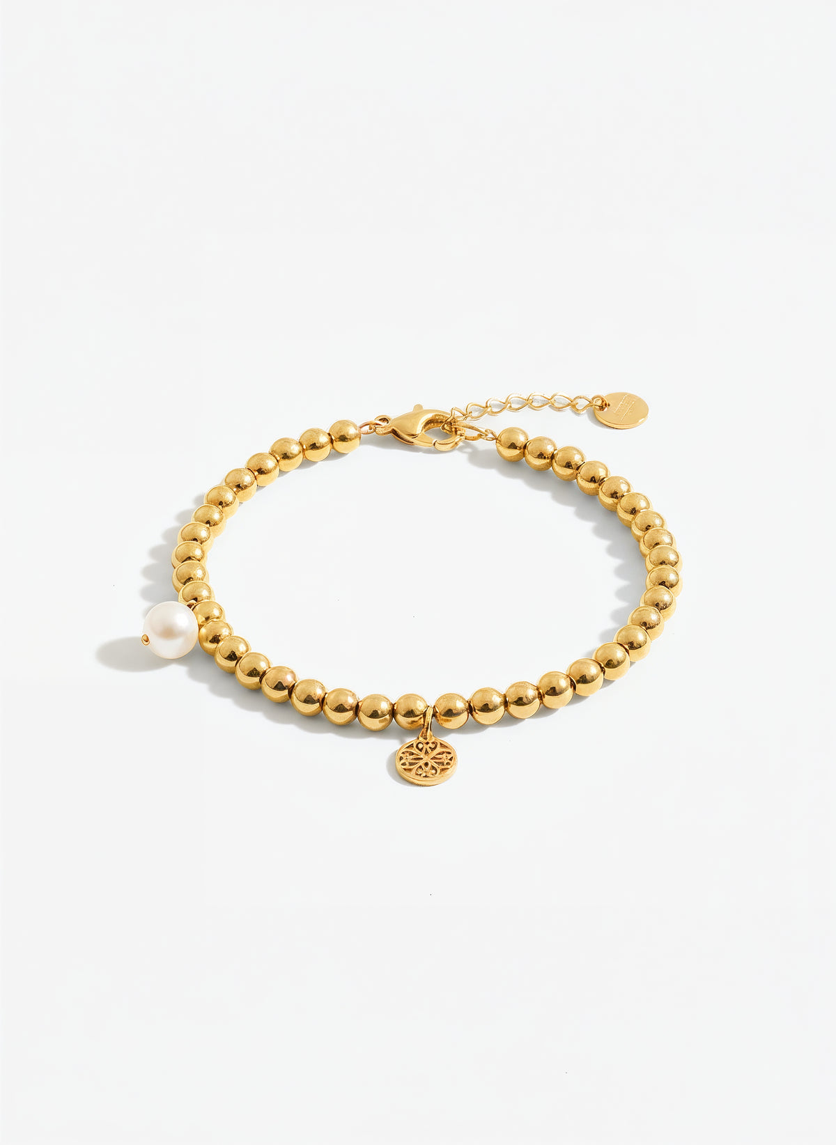 Das Solina Armband kombiniert glänzende Goldbeads mit einer einzelnen Perle und einem kleinen Sun-Charm – wie ein warmer Lichtpunkt am Handgelenk. Das Design wirkt bewusst casual, aber nicht beliebig: ein Bead-Armband mit feinem Symbol, das sofort sommerliche Leichtigkeit und gute Laune ausstrahlt. Perfekt, wenn du ein Piece suchst, das deine Looks weicher und gleichzeitig wertiger wirken lässt.
