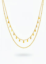 Die Naia Layers Kette spielt mit zwei feinen Linien, die sich wie ein Hauch von Leichtigkeit um dich legen. Kleine Plättchen und zarte Knoten bewegen sich sanft im Licht und geben dem Design eine ruhige, feminine Ausstrahlung – modern, klar und unaufgeregt schön.