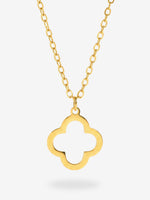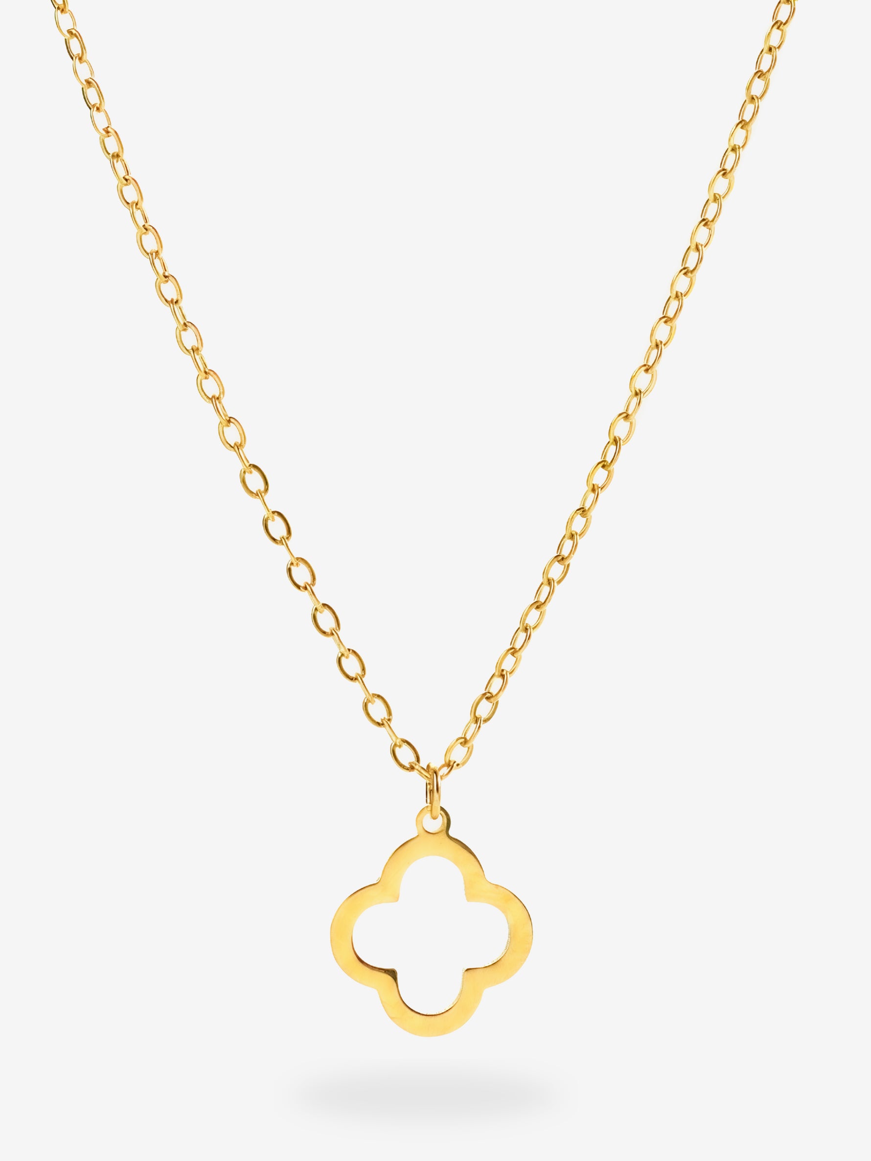 Die Thaleya Kette trägt einen offenen Clover-Anhänger, dessen vier weiche Bögen sich in der Mitte treffen und einen ruhigen Fokuspunkt bilden. Der Look ist clean, modern und feminin – ein kleines Statement, das sich easy zu Shirts, Blusen oder Kleidern kombinieren lässt, ohne zu verspielt zu wirken.