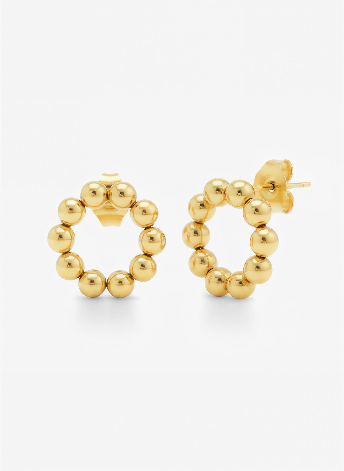 Die Orira Studs spielen mit Form und Gefühl: kleine, goldene Kugeln, die sich zu einem weichen Kreis verbinden – verspielt, klar und mit einer Präsenz, die man nicht erklären muss. Sie wirken leicht, fast schwebend, aber gleichzeitig bewusst gesetzt.