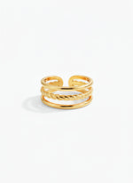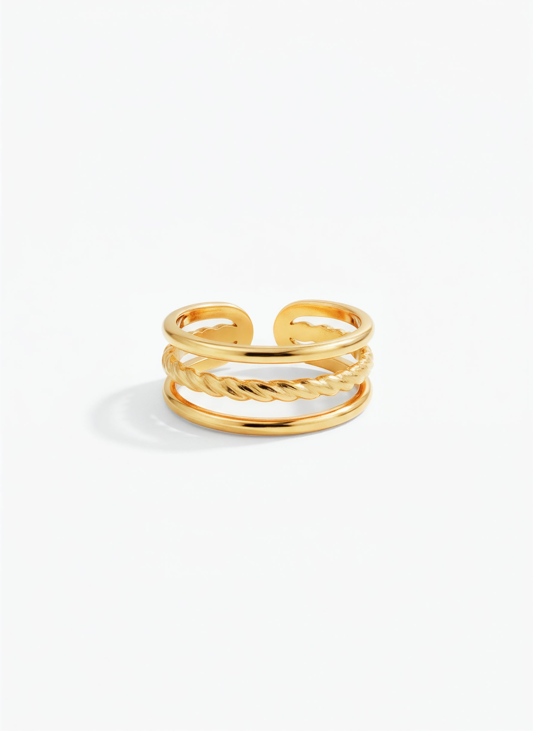 Dreireihiger Look mit glatten Schienen und gedrehter Mitte – passt als edles Essential dank der offenen Form an jeden deiner Finger.